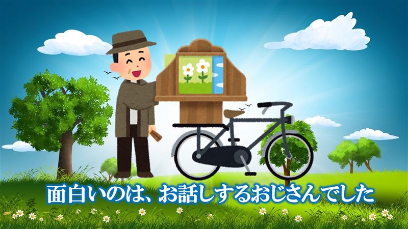 紙芝居のおじさんが、自転車に乗ってお話をしに来たのです。