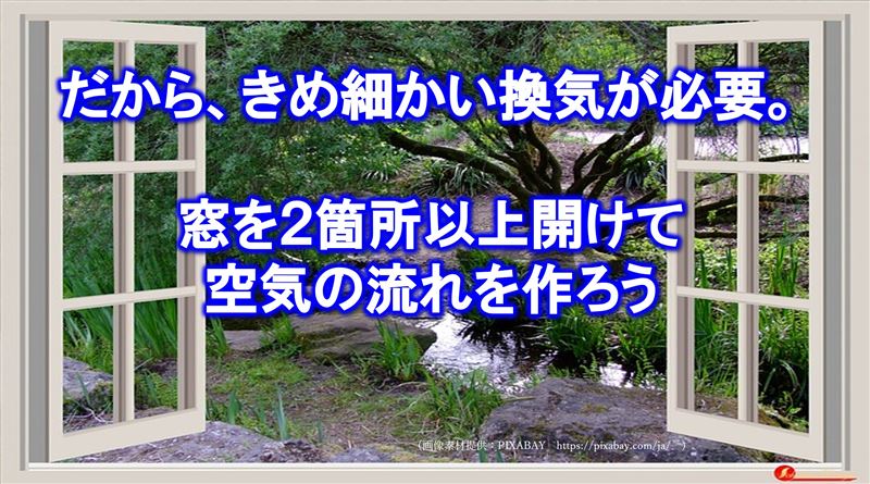 できれば2箇所窓などを開けて空気の流れを作ること、